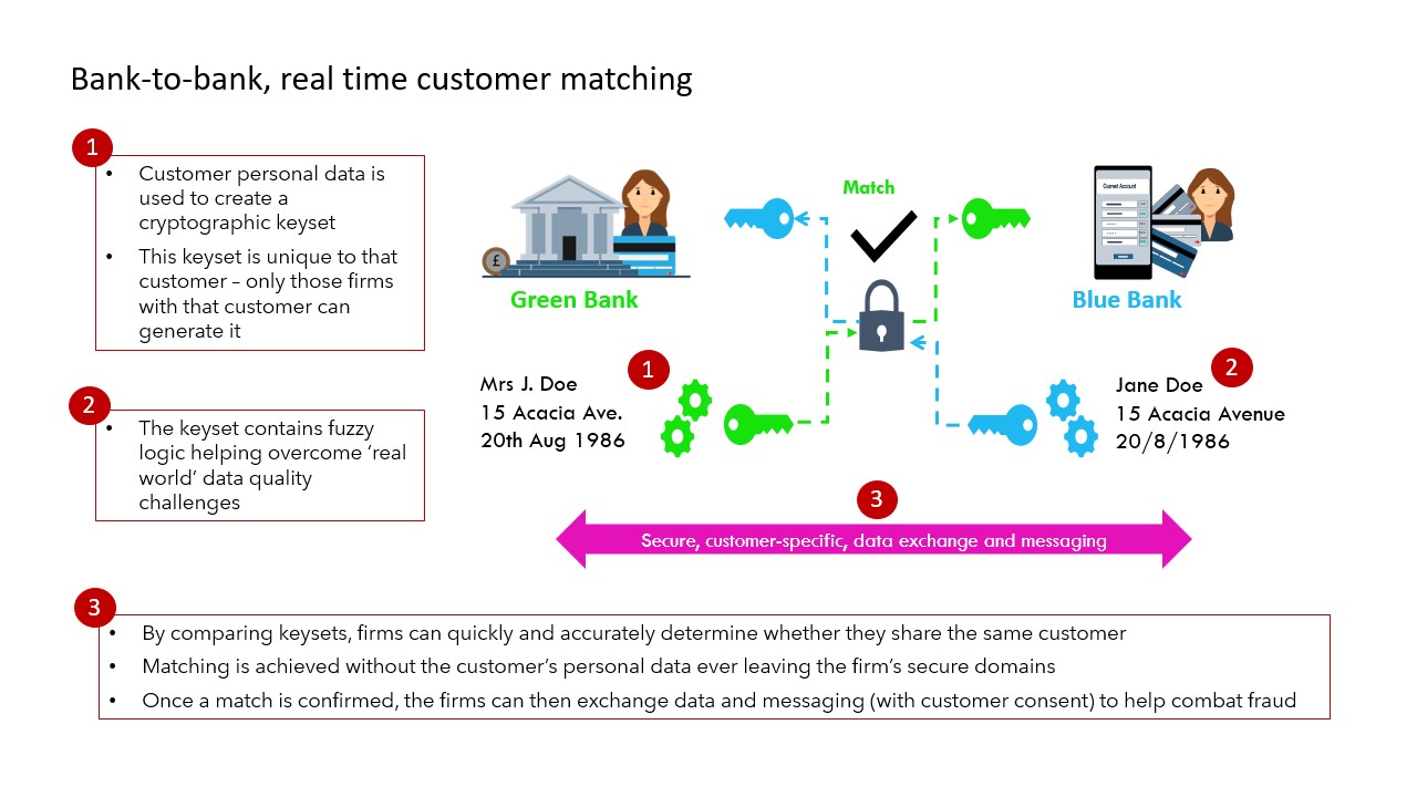 This provides an unparalleled level of protection for sensitive customer personal data, as it allows firms to match customers directly between themselves without ever having to share or reveal sensitive personal data outside their own secure networks.