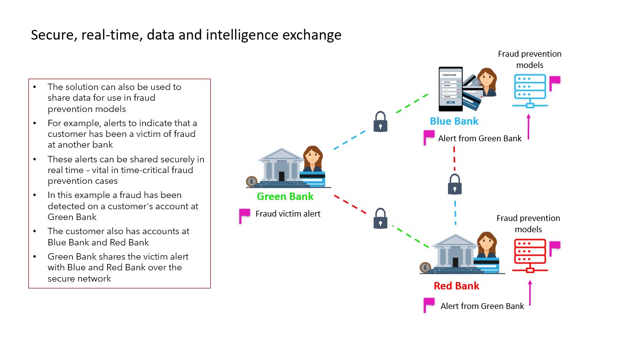 In the example below when Green Bank becomes aware that their customer has been a victim of fraud, they are able to share an alert with other firms on the network (Blue Bank and Red Bank) which share the same customer. In turn, these other firms can use this alert as an input to their own fraud prevention models and systems.