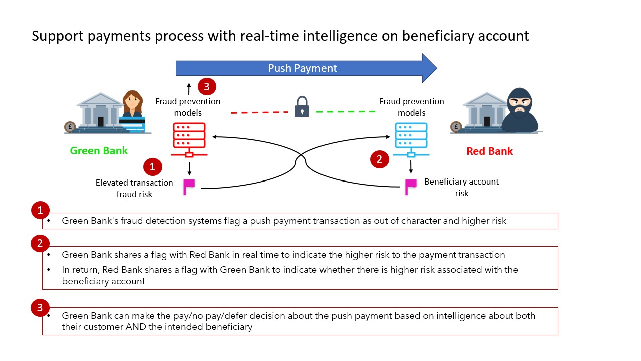 By using our solution, Green Bank can share a flag with Red Bank, alerting them to the higher fraud risk. In return Red Bank can share back with Green Bank a flag indicating whether the beneficiary account is also considered higher risk from a fraud perspective.
